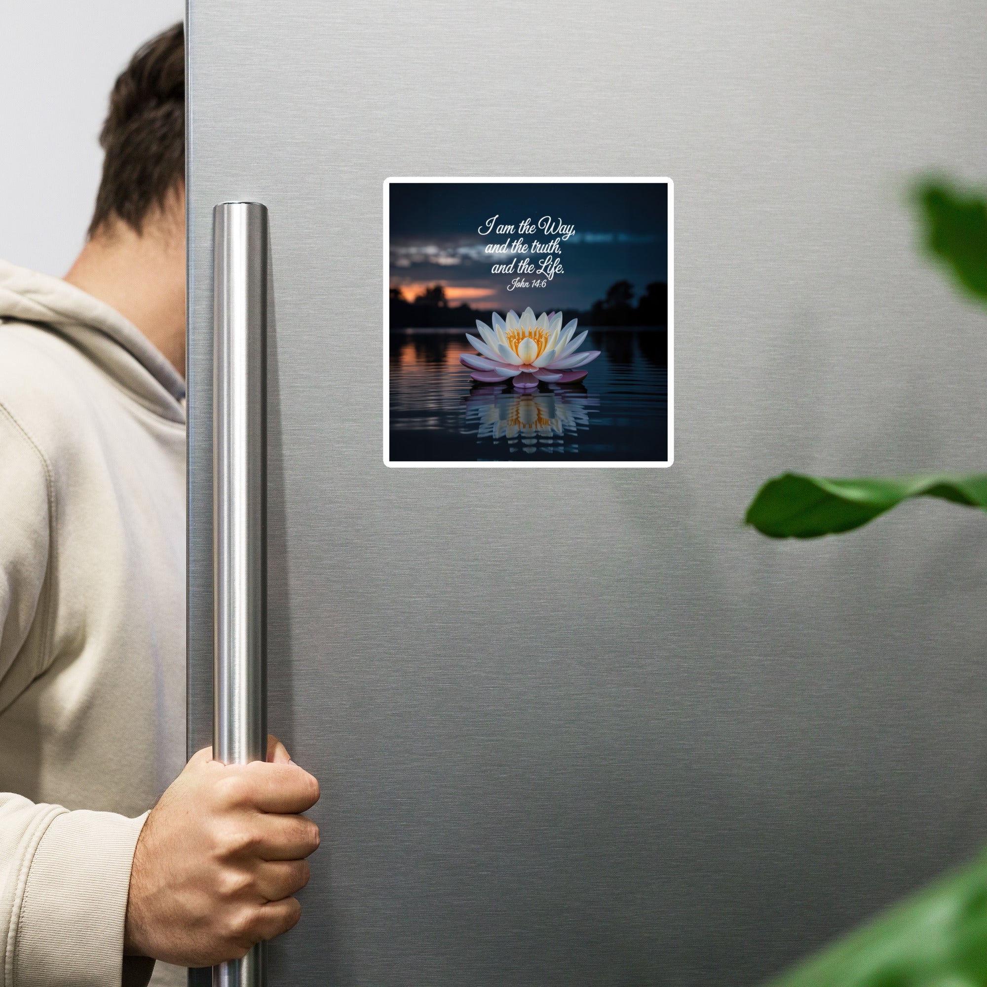 Embrace the profound message of John 14:6 with our elegant, die-cut magnet, perfect for spiritual inspiration at home, in the office, or as a thoughtful gift. This beautifully crafted magnet serves as a constant reminder of faith and guidance, interpreting the eternal words from the Bible: "I am the way, the truth, and the life." With its distinctive design and vibrant colors, it adds a meaningful touch to any magnetic surface.