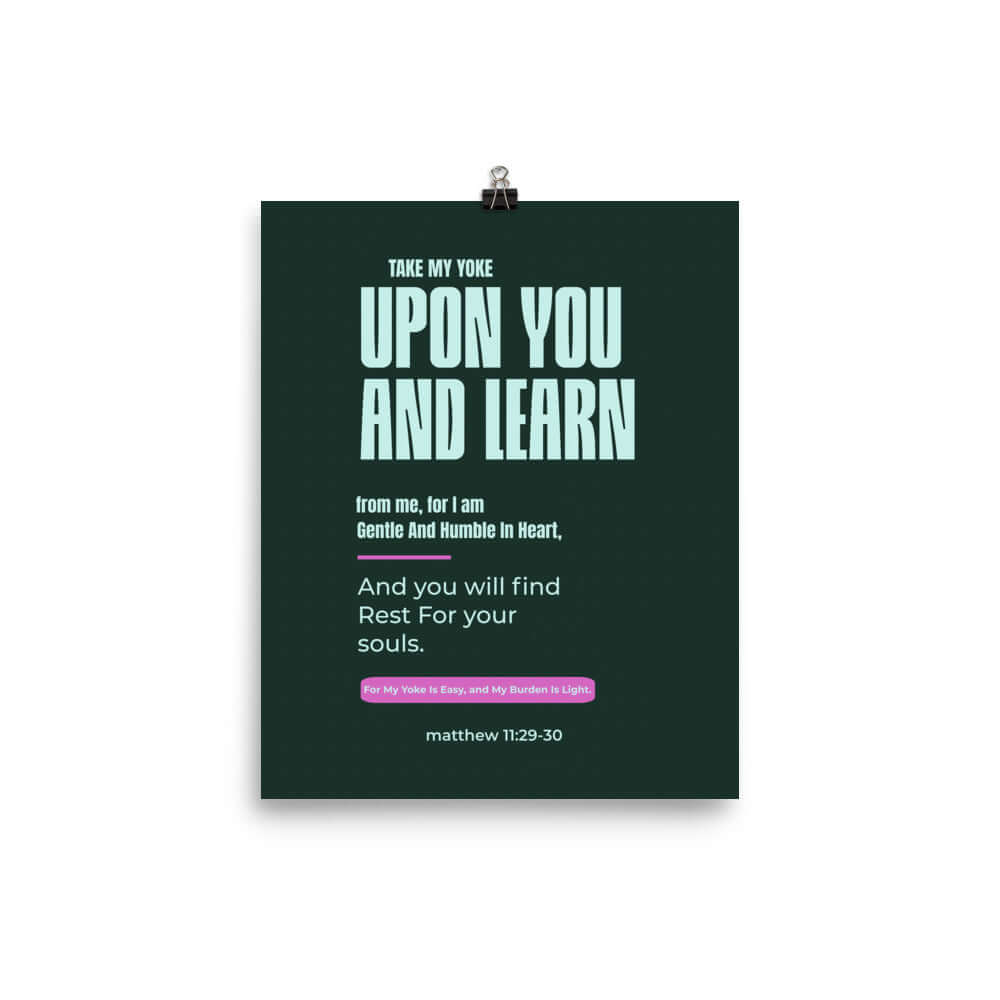 Embrace a daily moment of calm with this elegant poster, harmonizing your environment with its gentle message. Whether for personal inspiration or as a meaningful gift, this Matthew 11:29-30 Bible Verse Poster resonates with a timeless call to rest in humble peace.