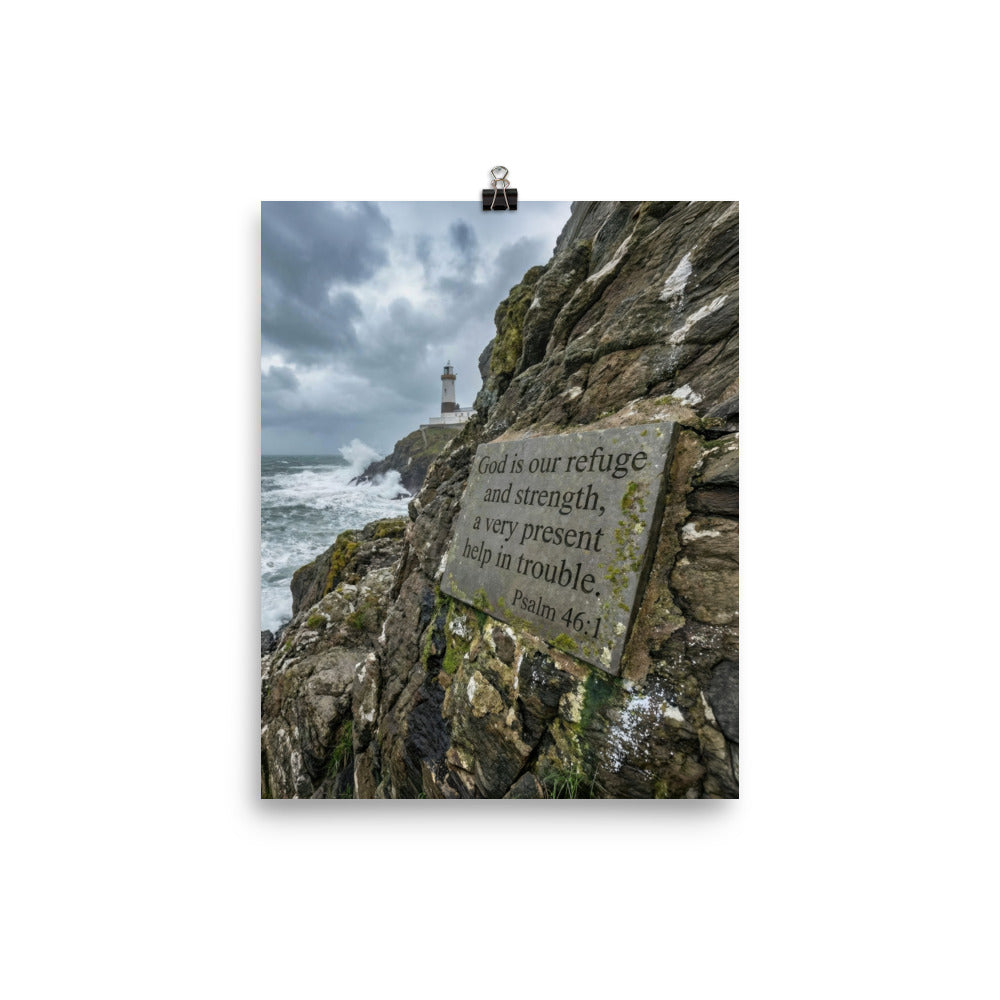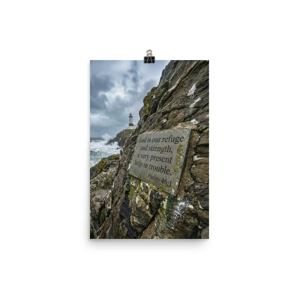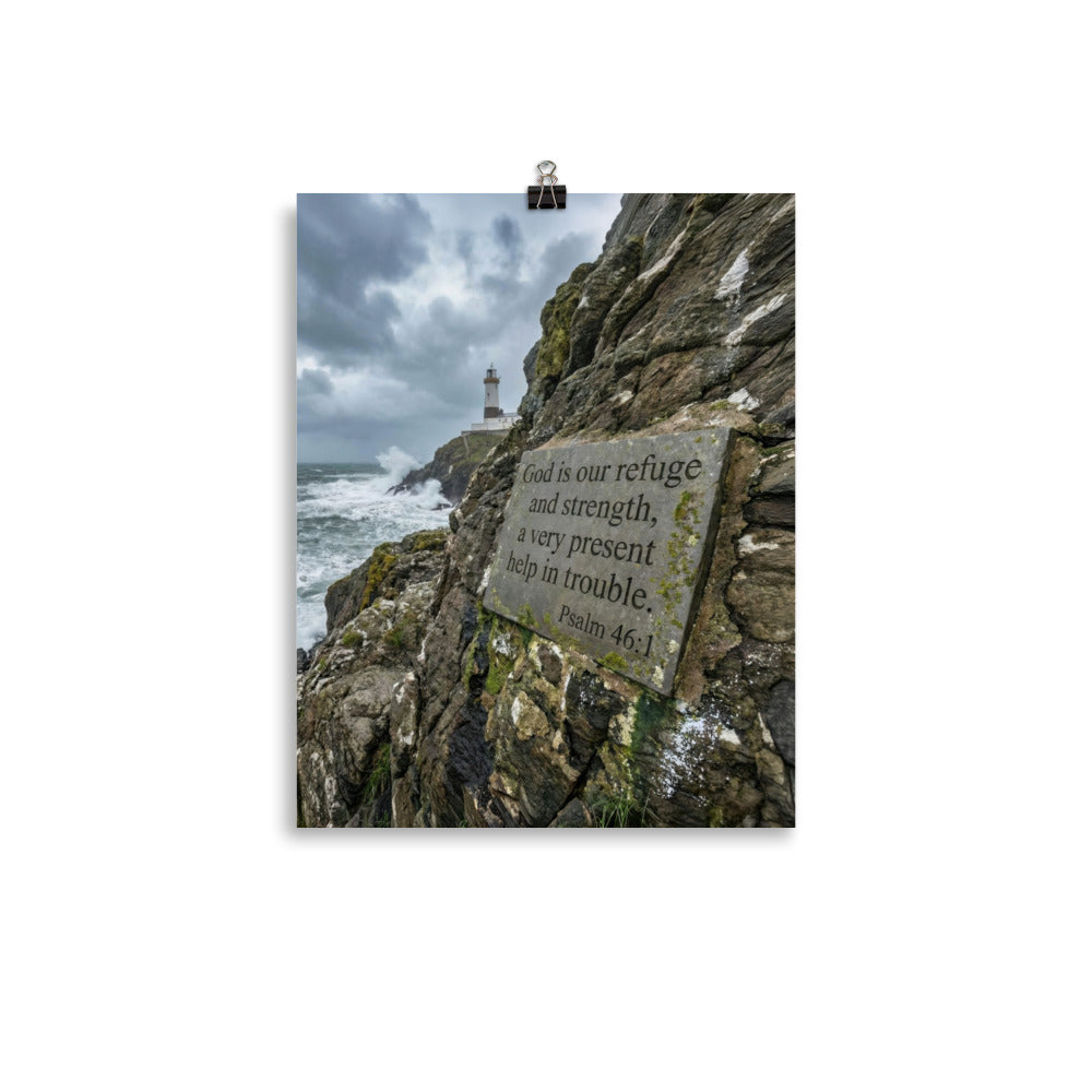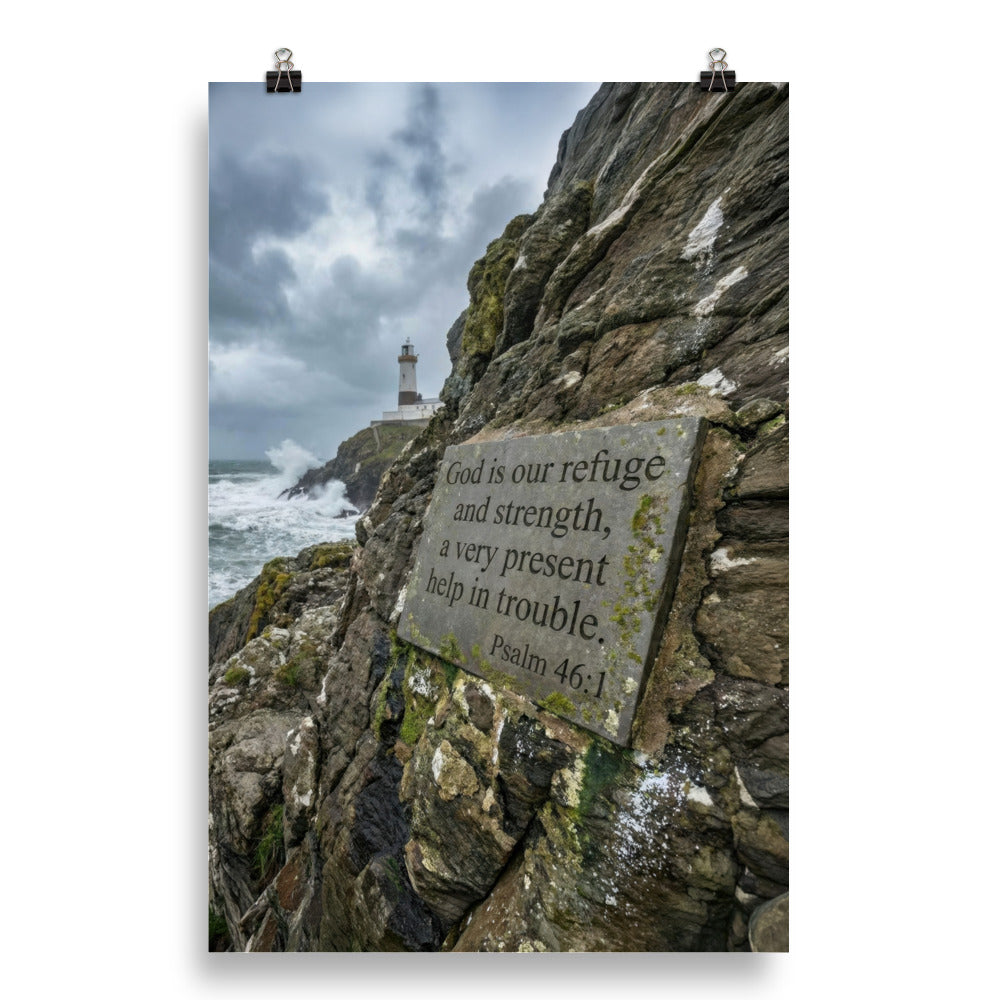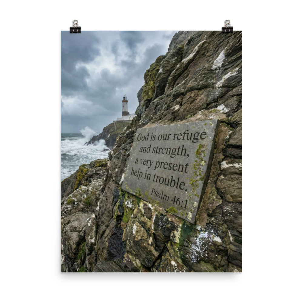 Crafted with care and created to inspire, our poster features the timeless words of Psalm 46:1: "God is our refuge and strength, an ever-present help in trouble." This powerful message is beautifully printed on high-quality matte paper, offering a smooth and sophisticated finish that complements any room's aesthetic.