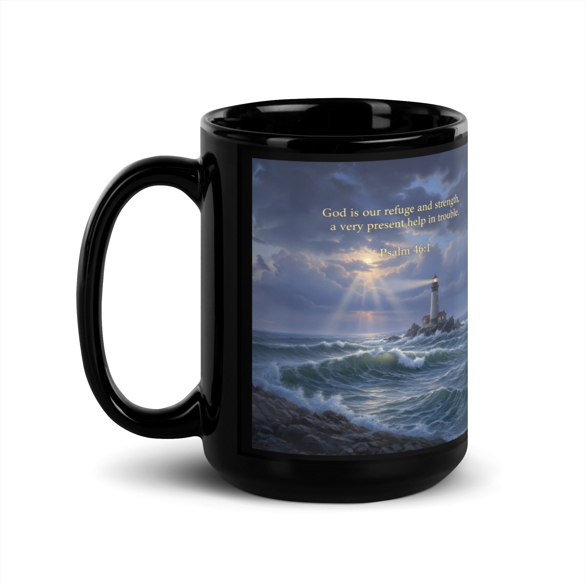Elevate your daily routine with the Psalm 46:1 Present Help Black Glossy Mug, and bring a piece of divine comfort into your home. This mug isn’t just a vessel for your drinks; it’s a reminder of strength, hope, and unwavering faith.