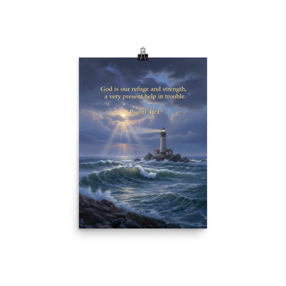 Crafted with care, this poster features the timeless scripture of Psalm 46:1, "God is our refuge and strength, a very present help in trouble," set against a serene backdrop that inspires peace and reflection. Perfect for gifting or as a personal reminder of faith and resilience, this poster complements any décor with its high-quality finish and thoughtful design.